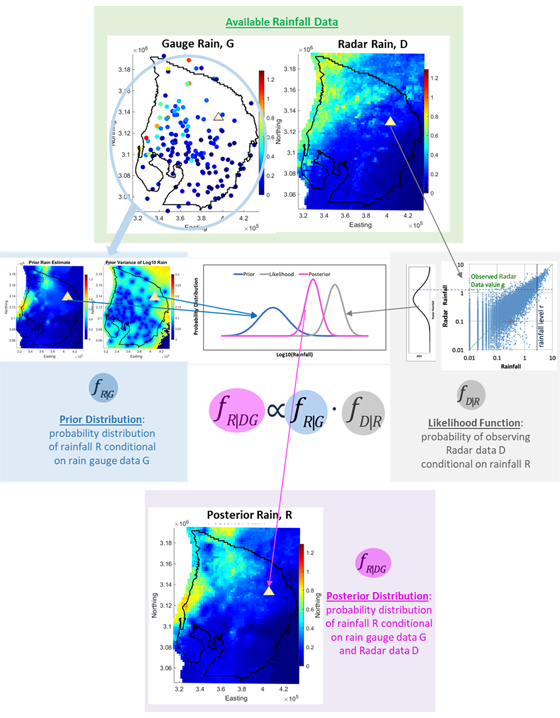 To improve the accuracy and resolution of the estimated historical rainfall, a Bayesian statistical approach has been utilized to integrate the rain gauge data and rainfall data derived from NEXRAD. Rain gauge data were used to develop the prior distribution and radar rainfall uncertainty was used to derive a likelihood function. The resulting Bayesian radar rainfall accentuates the strengths of the rain gauge and radar data while de-emphasizing their weaknesses. Bayesian radar rainfall agrees with the gauged data at radar pixels co-located with gauges and is corrected for the radar rainfall biases. In addition, it reduces the uncertainty of the estimated rainfall.