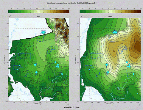 The method was shown to be valid and has been used to couple with an optimization routine for wellfield management program at Tampa Bay Water. The URM is used on a weekly basis to rotate well and wellfield pumping for the purpose of maximizing aquifer water levels relative to aquifer target controls that represent protective water levels for wetlands, lakes, and rivers. The URM was demonstrated to be linear and robust over a range of well pumping rate perturbations, pulsing durations, and seasonal initial conditions. Further investigation using stochastic rainfall realizations showed minor ensemble variation which confirmed the independency of the URM from rainfall. The ensemble median was used in the final development of the URM. In the animation to the left, weekly aquifer water level contours were interpolated from data at INTB model grid cells that were computed using URM. Click here to read/download report (1 MB)